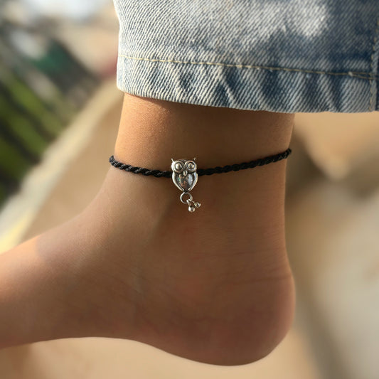 Silver Cylindrical Bead Nazarbattu Black Thread Anklet