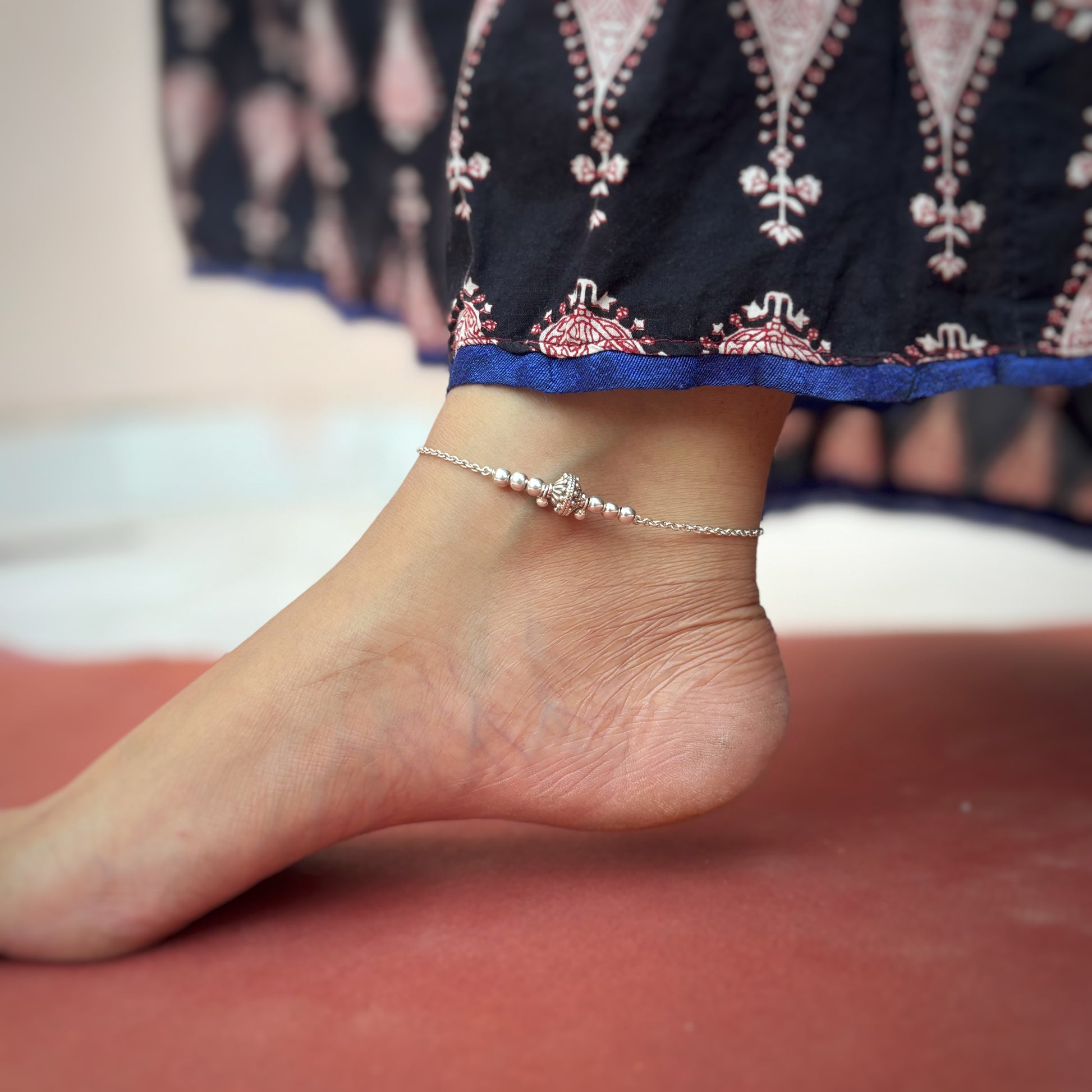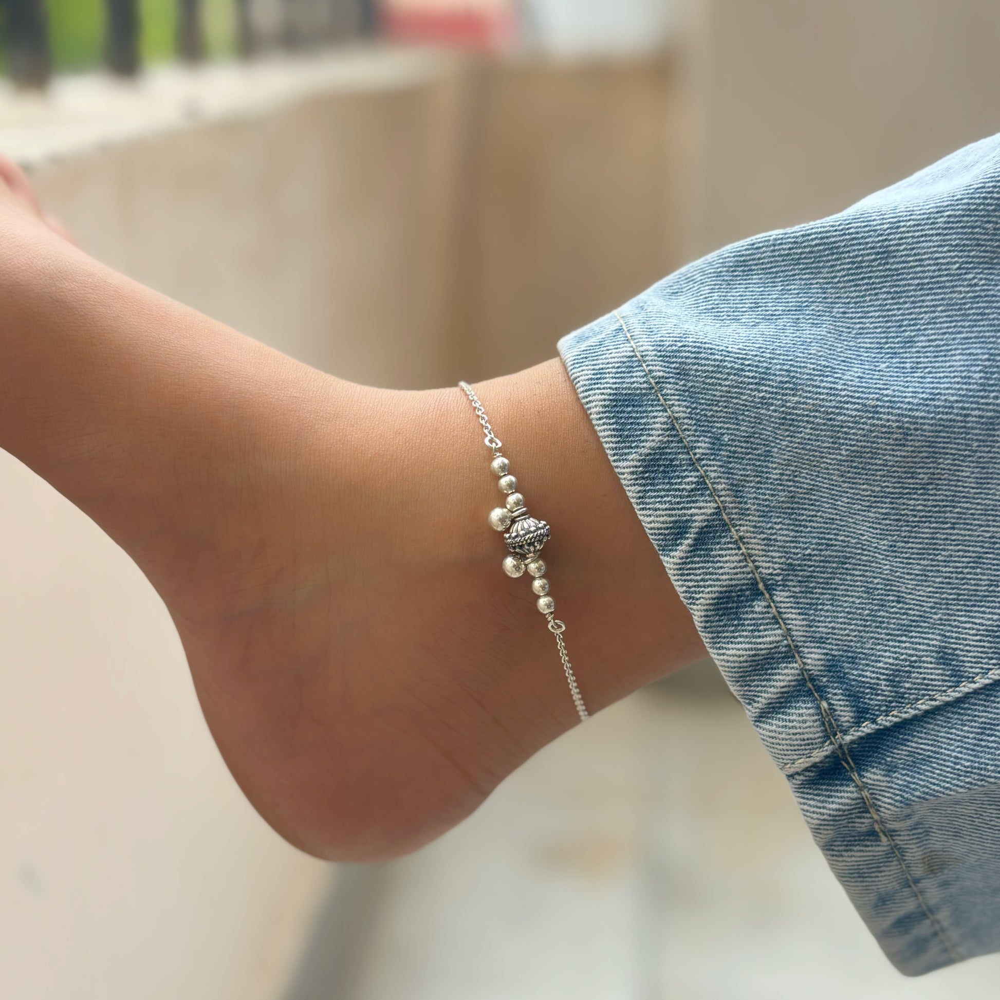 Presenting the ideal fusion of tradition and simplicity, Silveristhan offers the 925 Silver Antique Ball Anklet. This anklet is real and has a long-lasting sparkle since it is handcrafted by skilled artisans using pure 925 sterling silver. The lovely appearance created by the antique ball design goes well with any ensemble. It is designed for everyday wear and is lightweight and comfortable, allowing you to wear a little something elegant every day. This anklet symbolizes the purity of handcrafted silver jewelry and adds a subtle sophistication to your ankle, whether it's worn for a joyful occasion or a laid-back evening.