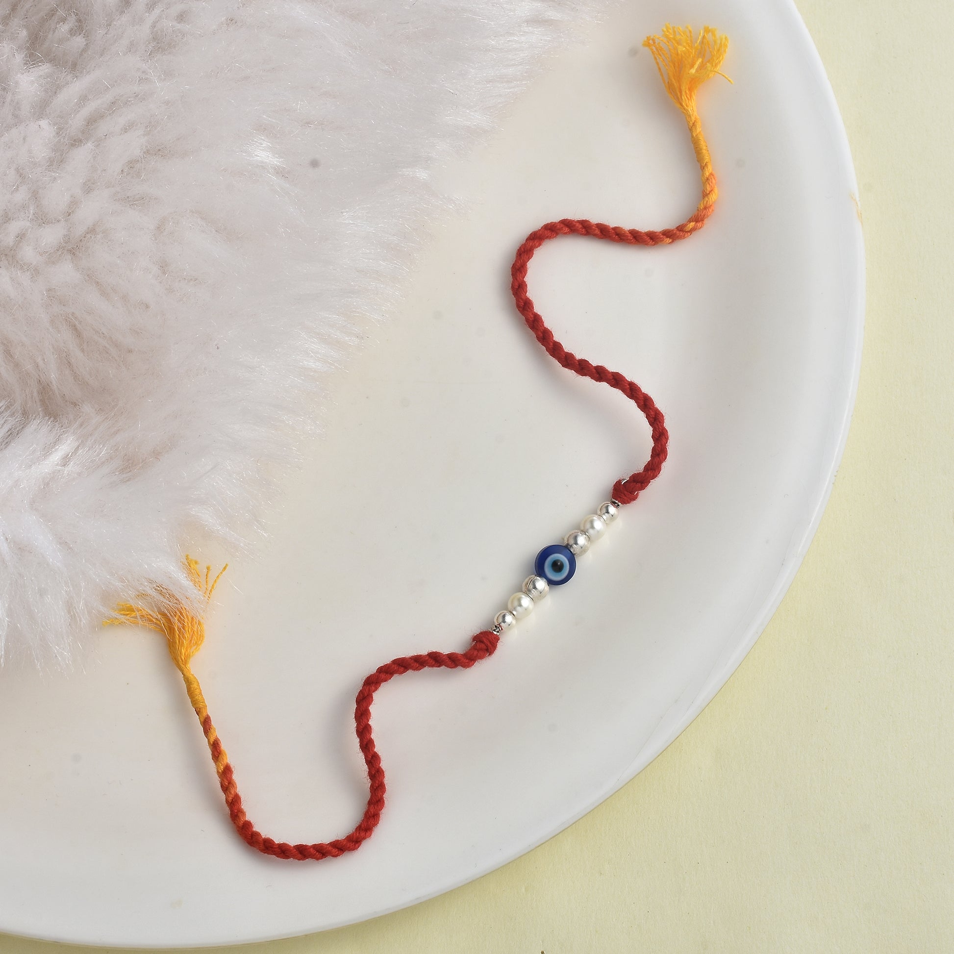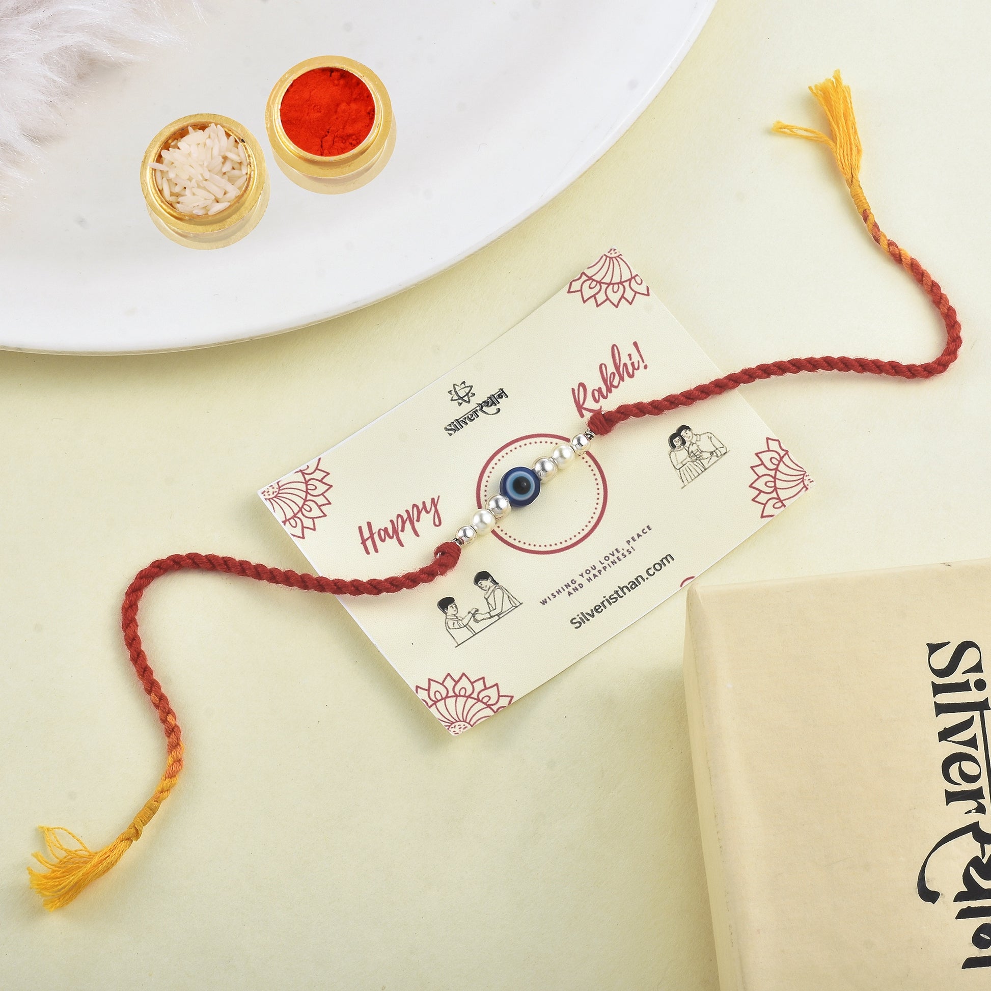 With our Silver Evil Eye Rakhi, which is designed to repel and shield against bad energy, you can embrace tradition. Crafted from sterling silver, this sleek and contemporary design features the well-known evil eye symbol. Ideal for giving your Raksha Bandhan celebrations a deeper spiritual meaning and guaranteeing your brother's success and well-being.