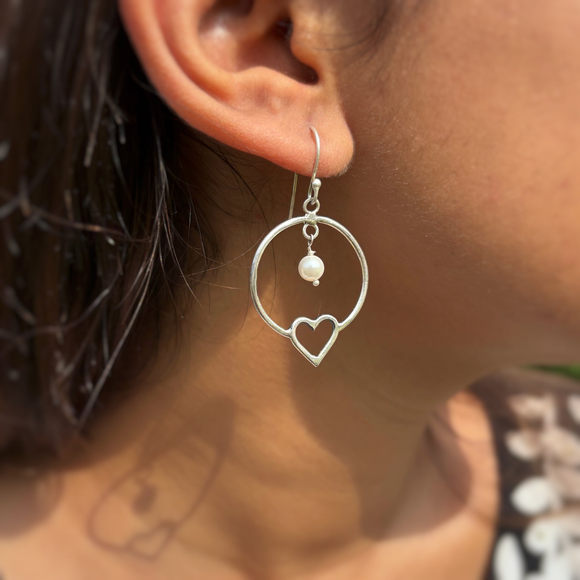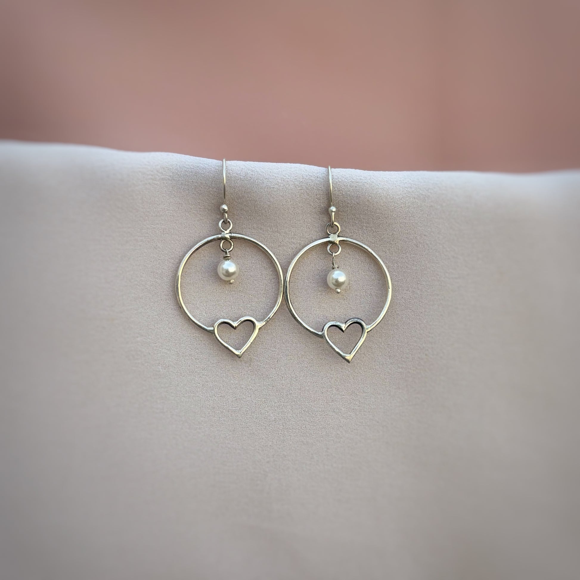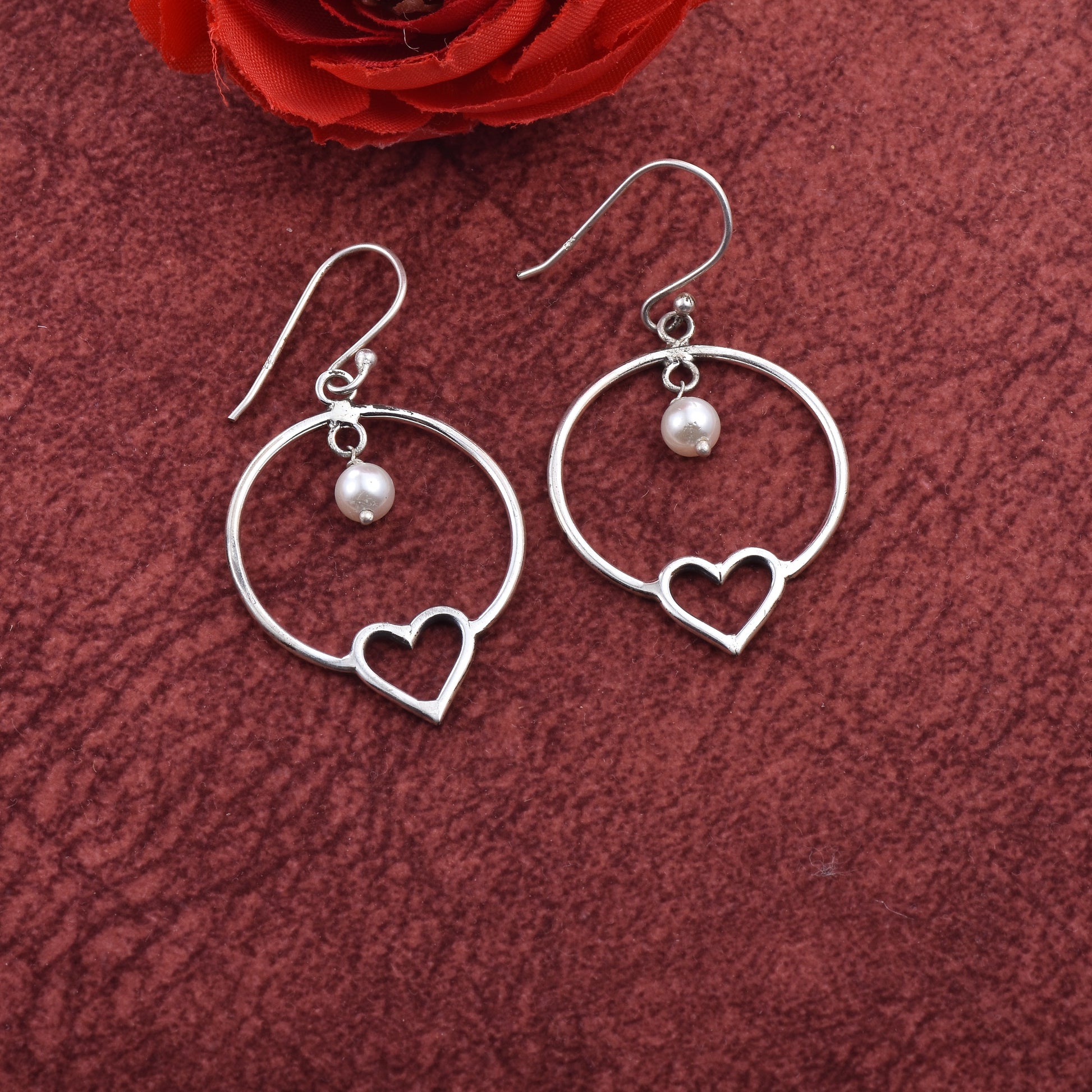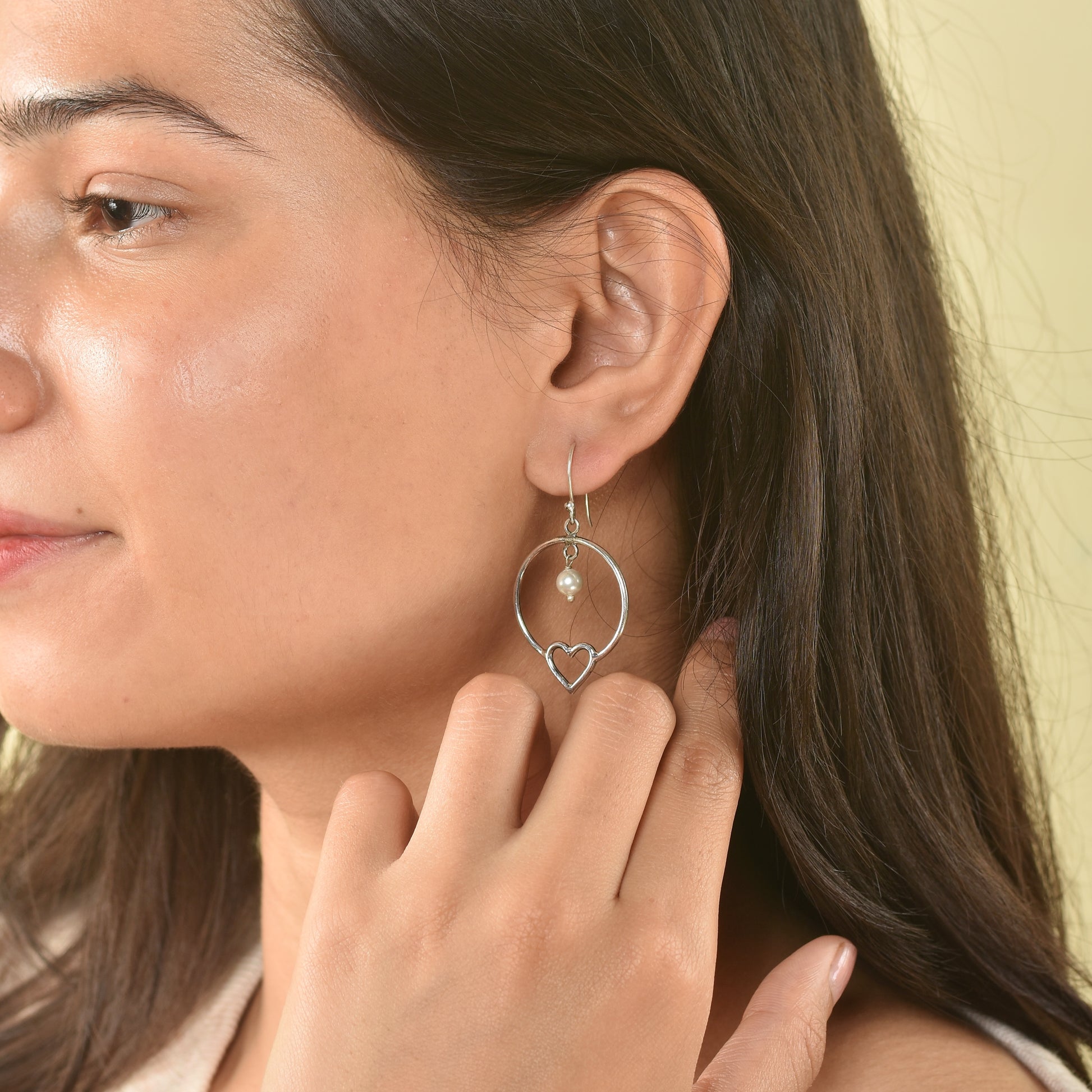 The elegance of silver hearts and the charm of pearls are combined in our Silver Pearl Heart Dangle Earrings. These delicate dangles give every ensemble a delicate, romantic touch. These earrings are ideal for lending a touch of refinement to any event, whether you're buying them for yourself or as a kind present.
