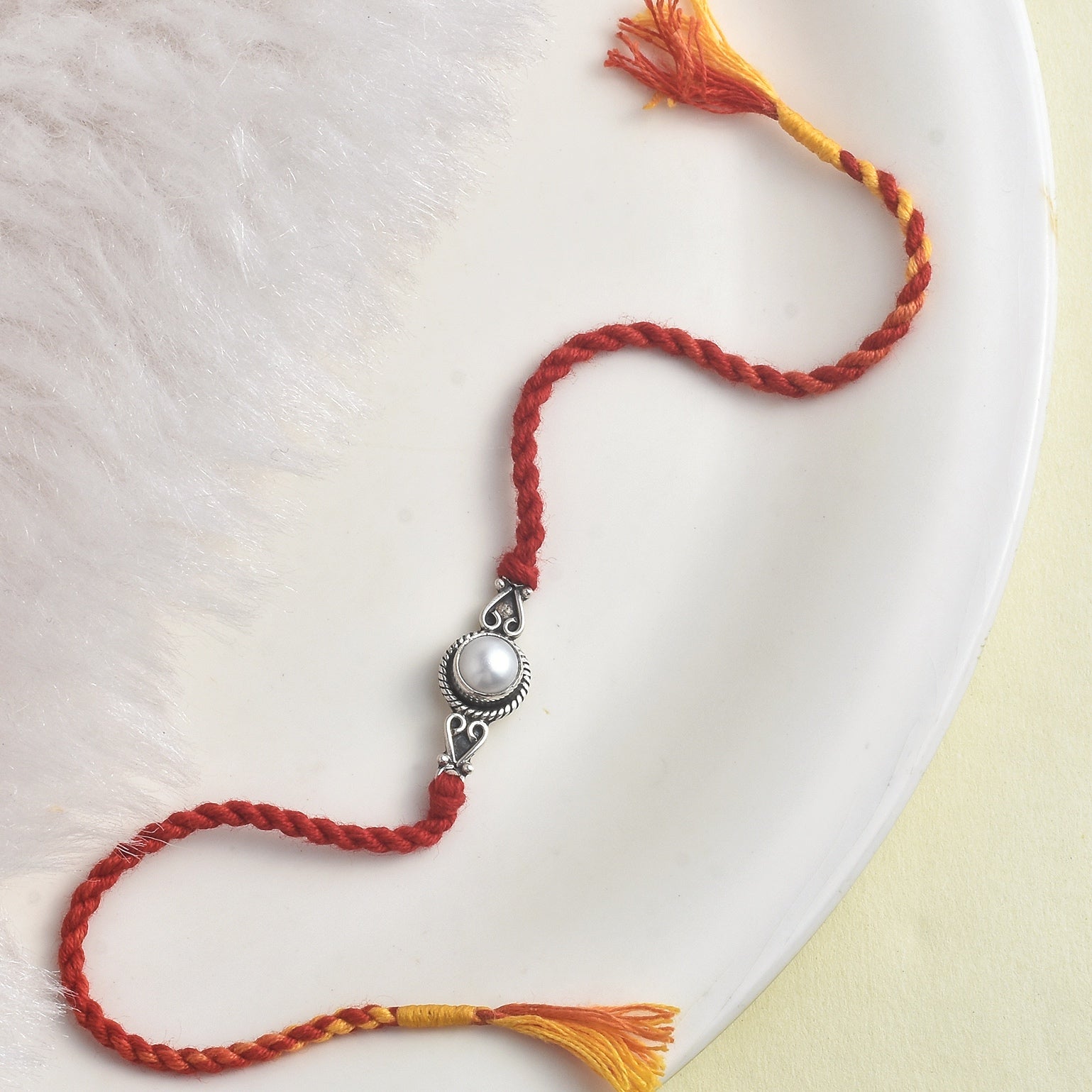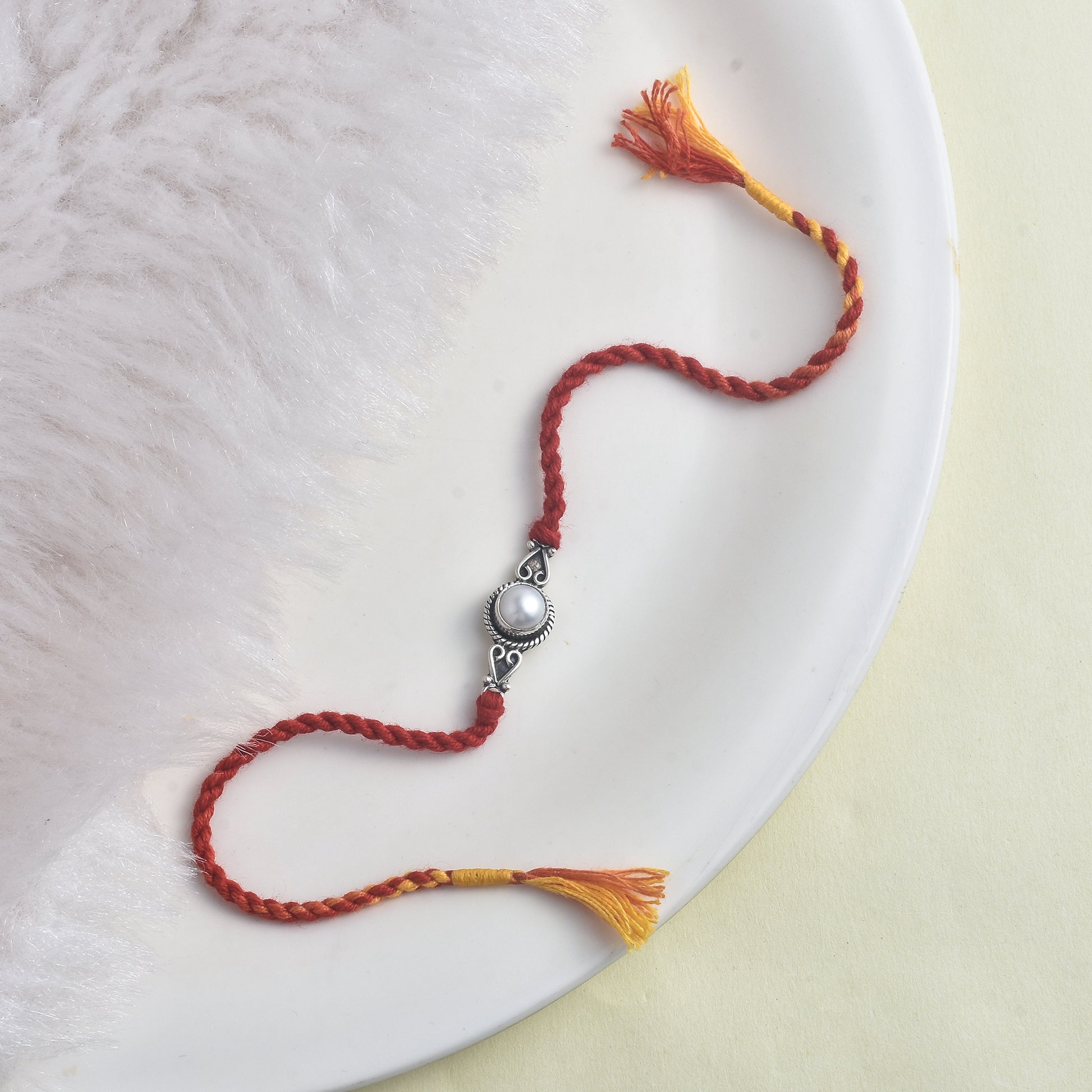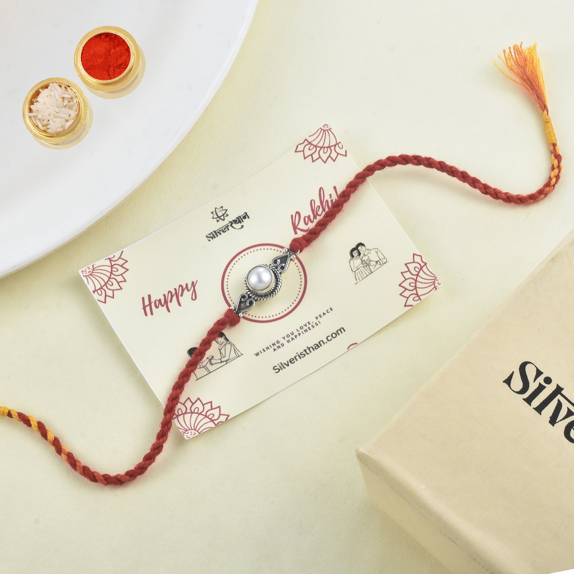 With our Silver Spiral Pearl Rakhi, you can up your game on your Raksha Bandhan festivities. It is elegant and charming, delicately created with spirals of sterling silver and beautiful pearls. This rakhi is ideal for showing respect and love since it is a classic representation of a sibling relationship. Add a dash of sophistication and tradition to make this holiday one to remember.